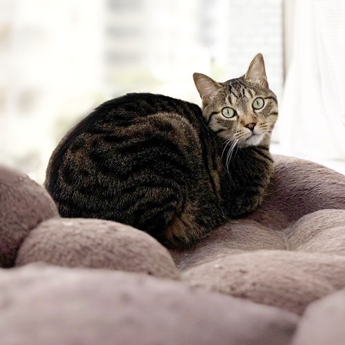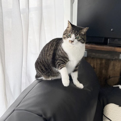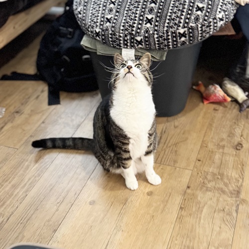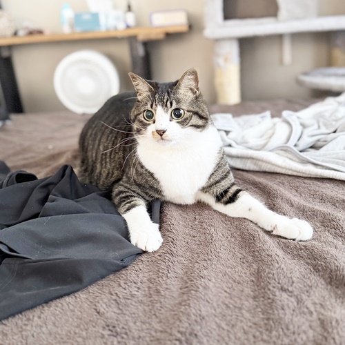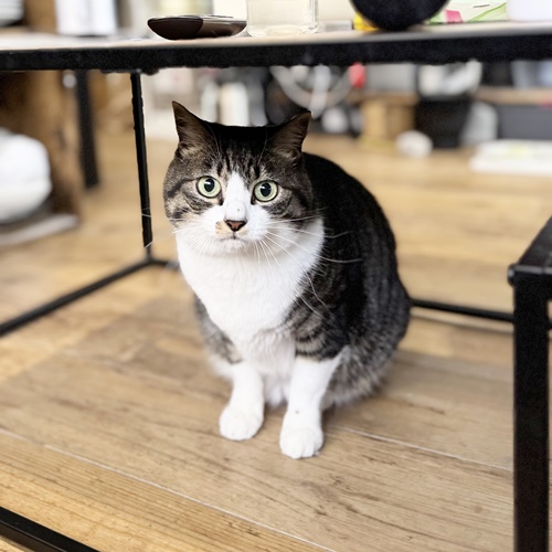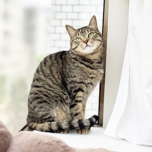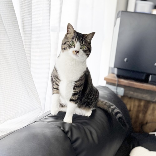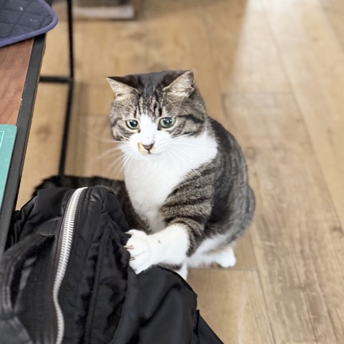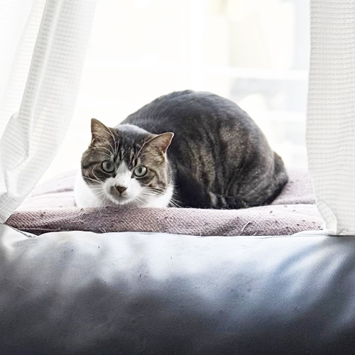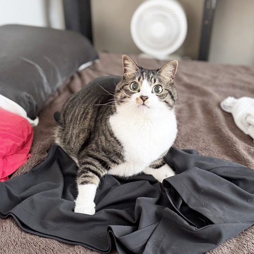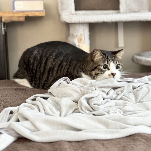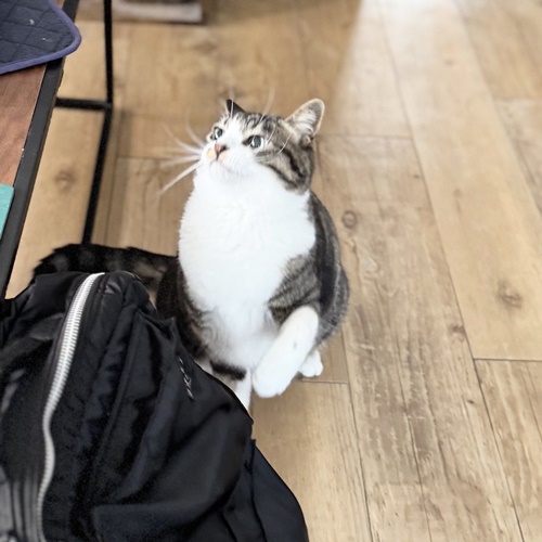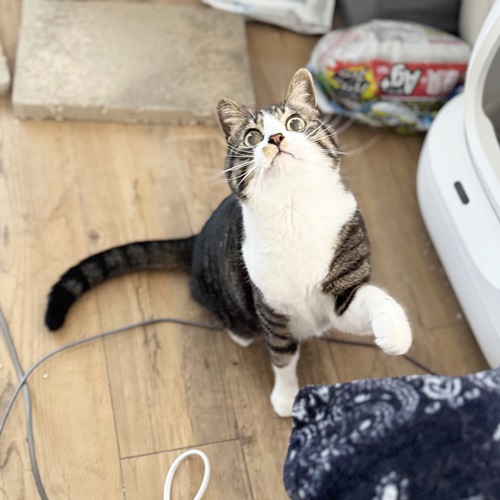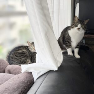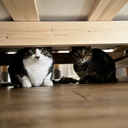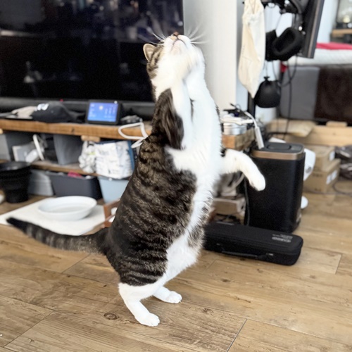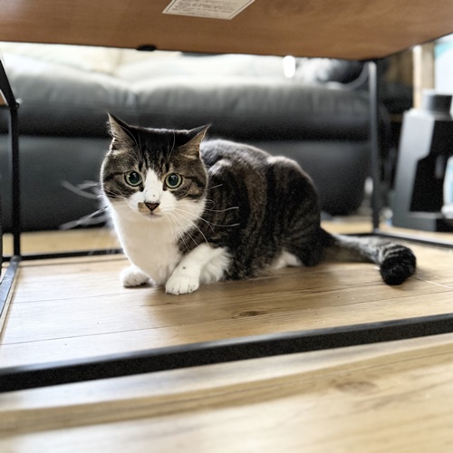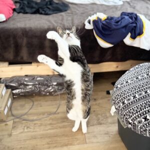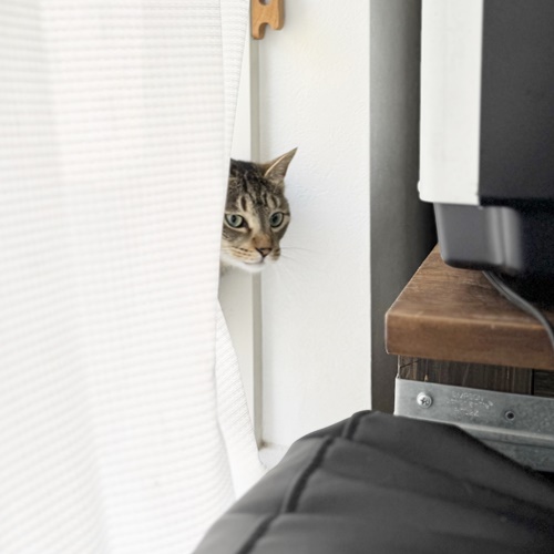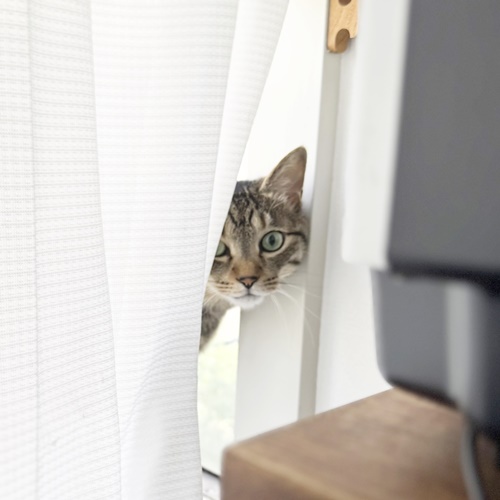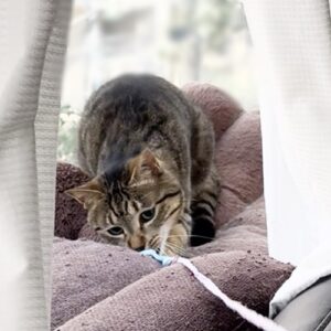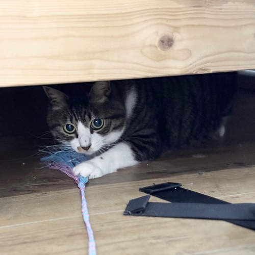 カーテンの裏やベッド下にピットインでお隠れになりますが、本当はちょっと遊びたくて、オモチャをフリフリするとペシペシと遊んでくれます。
