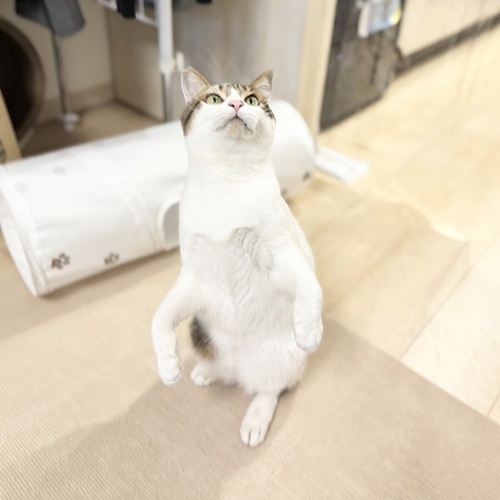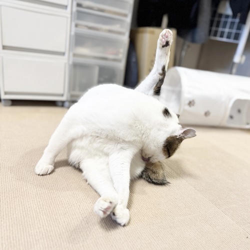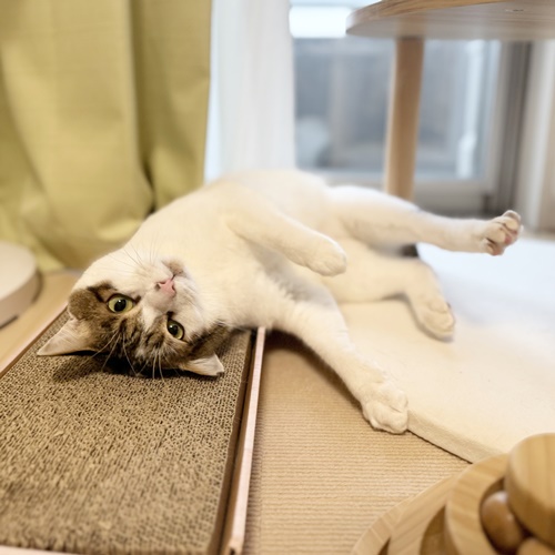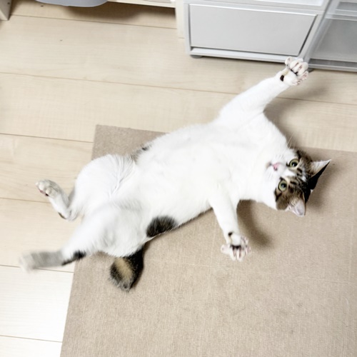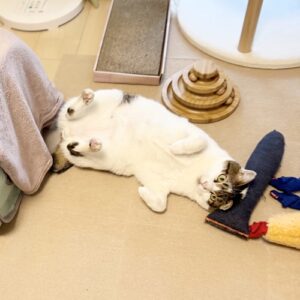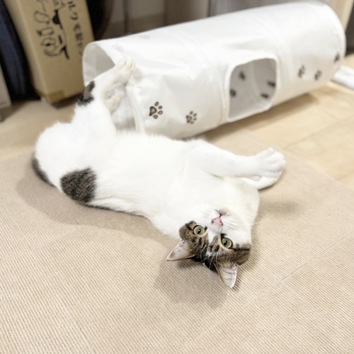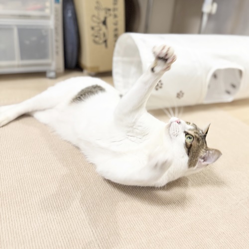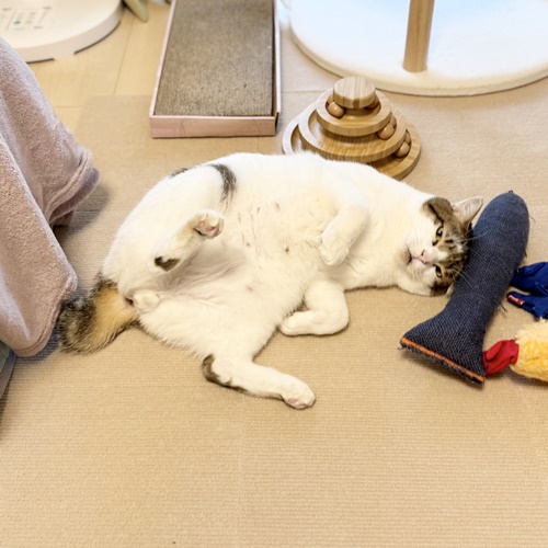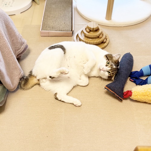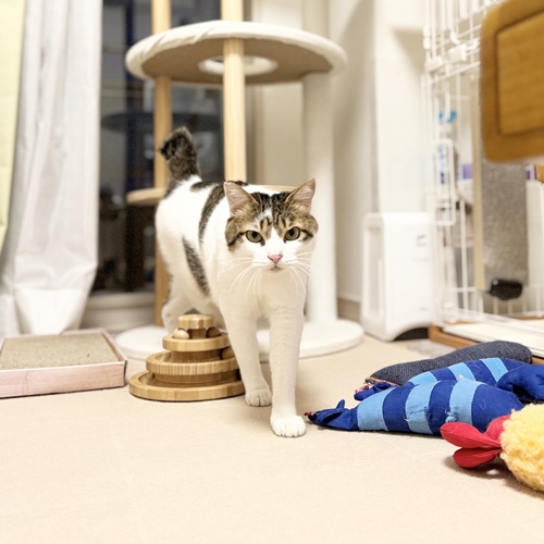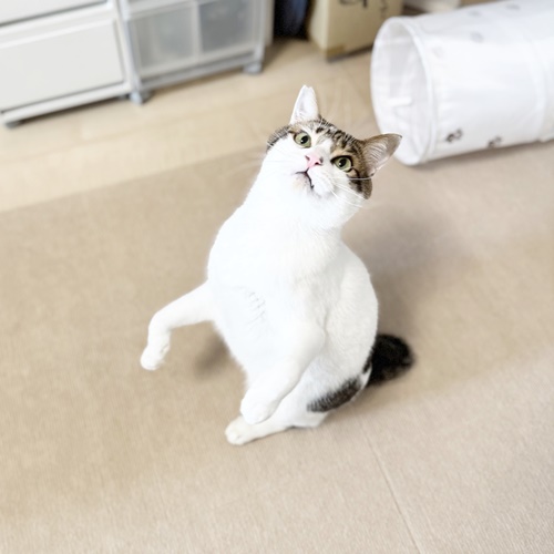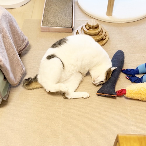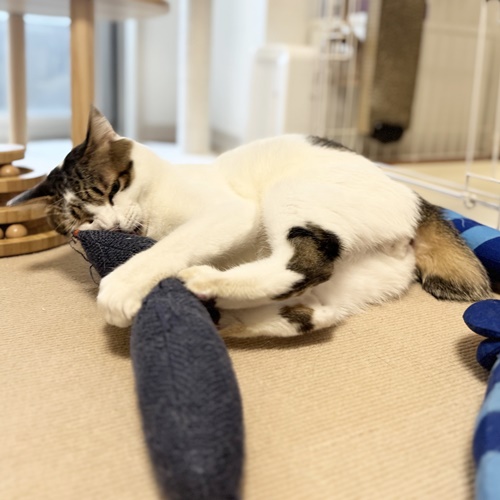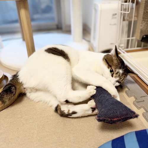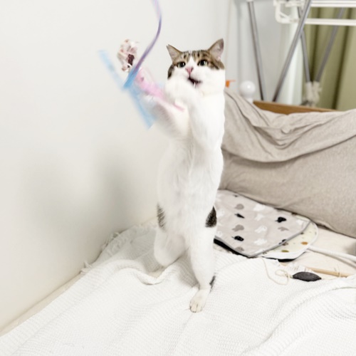 キリにゃん、遊んでいるとオモチャしか見えてなくて、シッターに激突したり、立ち上がって後ろに行くオモチャを追ってゆる~っと座り込んだりしちゃうんですよ。笑